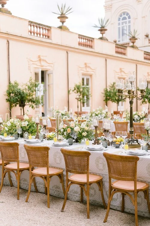 The reception tables, set in the villa’s grand courtyard, exuded effortless elegance. Decorated linens with delicate monograms, Italian classic cane chairs, and lush floral arrangements in soft pastel hues set the scene. Fresh green grapes were arranged among the table settings, a nod to Italy’s rich winemaking tradition, while personalized bottles of limoncello awaited each guest, a sweet keepsake to bring home.